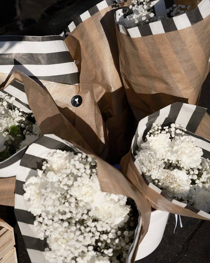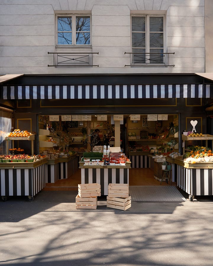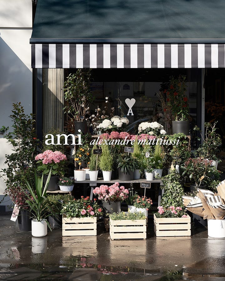 Quelques semaines après l’ouverture de sa nouvelle boutique parisienne, en plein cœur du Haut-Marais, Ami signe une opération de communication forte pour marquer cette nouvelle installation. En effet, la marque a investi quelques adresses emblématiques environnantes, qu’elle a transformées pour l’occasion aux couleurs de son identité : le café qui lui fait face, Le Progrès ; une boulangerie artisanale, Petite Île ; un fleuriste responsable, O’Fleurs d’Églantine ; et le primeur Le Jardin des Délices. Ainsi, toute la rue de ce quartier ultra central et stratégique — car fréquenté à la fois par toute une population mode locale et par les touristes — est devenue « Ami ». Une mise en scène pensée pour être photographiée, mais aussi pour être appropriée (facteur clé de viralité), puisque chacun peut, au choix, s’acheter une pomme avec un petit autocollant Ami, un bouquet aux couleurs de la marque, ou se photographier sur un siège en cannage noir et blanc. C’est efficace, à n’en pas douter.